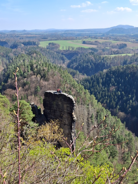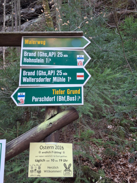 Wir haben lange gewartet, aber nun war es wieder soweit. Vom 10.04.-12.04.2026 machten wir uns wieder auf den Weg in die Sächsiche Schweiz.. In der Ochelbaude bei Rathmannsdorf sind wir nun schon seit Jahren Stammgäste.. Bei strahlendem Wetter, aber niedrigen Temperaturen, wanderten wir direkt vom Quartier ins Polenztal, vorbei an der Walterdorfer Mühle. An der Brandbaude, auch "Balkon der Sächsischen Schweiz" genannt, erwartete uns einen fantastischer 180-Grad-Panoramablick über gesamte Vordere und Hintere Sächsische Schweiz mit vielen Tafelbergen am Horizont u.a. dem Lilienstein und Königsstein .